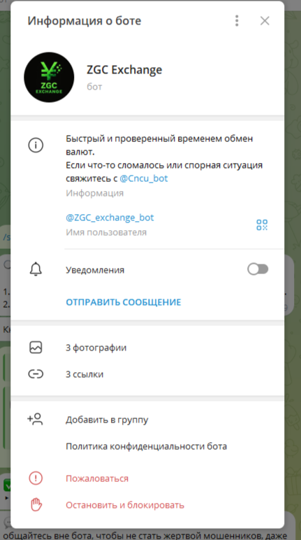 Обменник в Телеграме Zgc Exchange Bot нельзя назвать безопасным и надежным. Мы не рекомендуем читателям пользоваться услугами данного сервиса. Быстро и безопасно обменять свой фиат и крипту можно на проверенных платформах. Каких – в наших экспертных статьях упомянуты лучшие сервисы для обмена.