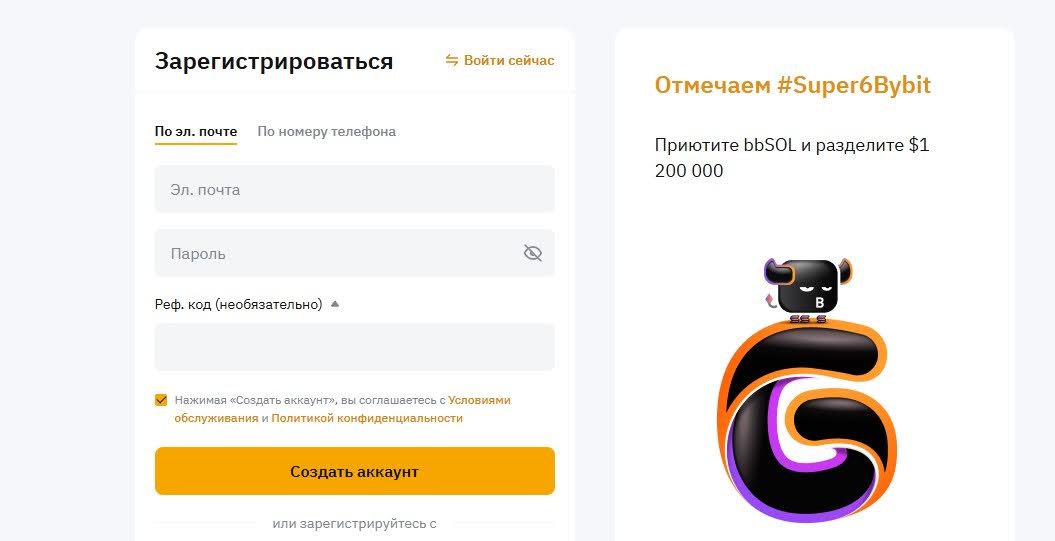 Для начала нужно зарегистрироваться и создать аккаунт. Поэтому первым делом нажимаем на сайте Байбит кнопку «Регистрация».