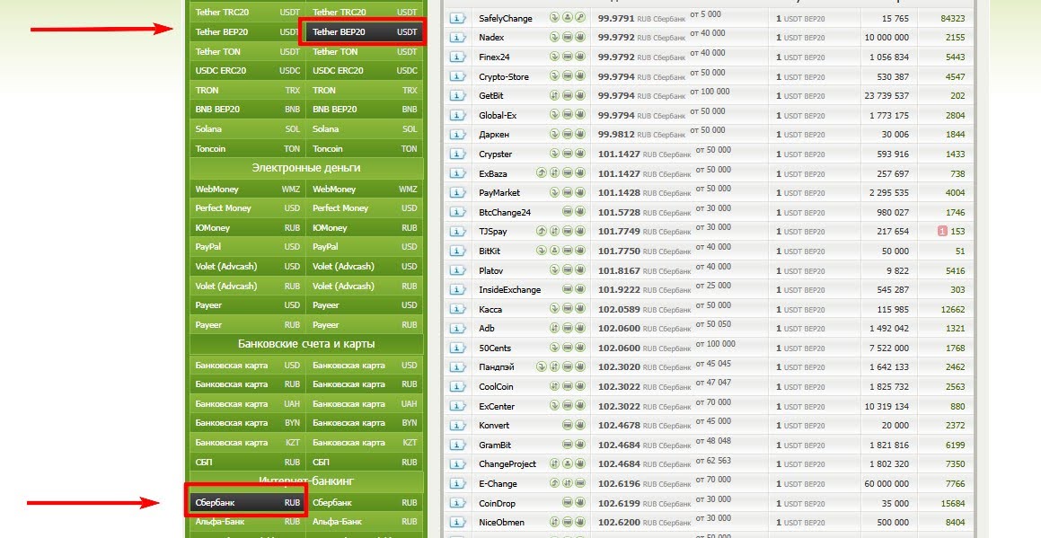 На главной странице BestChange слева есть два зеленых столбика. Первый называется «Отдаете», здесь отмечаем свой банк, например, Сбер. Второй столбик – «Получаете», в нем указываем нужную нам крипту.