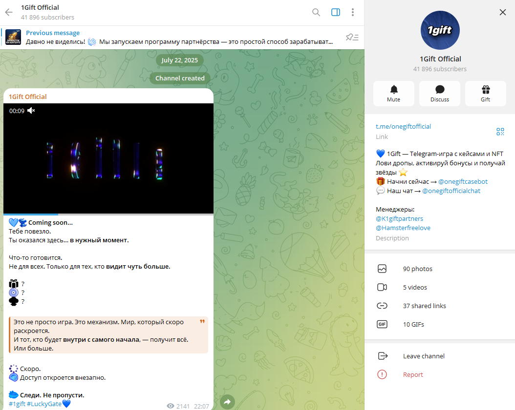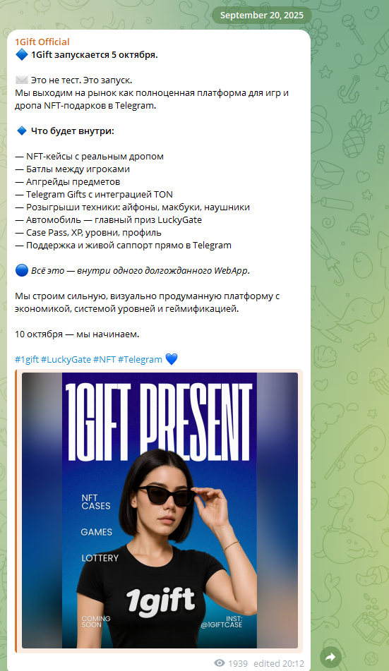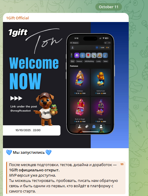 Прогрев аудитории начался в середине лета 2025 года. Тогда запустили Тг-канал 1 Гифт onegiftofficial.