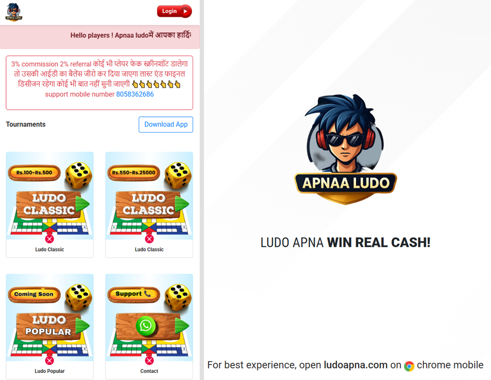 Apnavipludo – новая версия многопользовательской онлайн-игры, рассчитанной на 2, 3 или 4 человек. Формально она доступна только для пользователей в Индии, так как процесс завязан на телефоны индийских операторов. На настоящий момент функционируют три платформы с похожими, но имеющими отличия, условиями:
