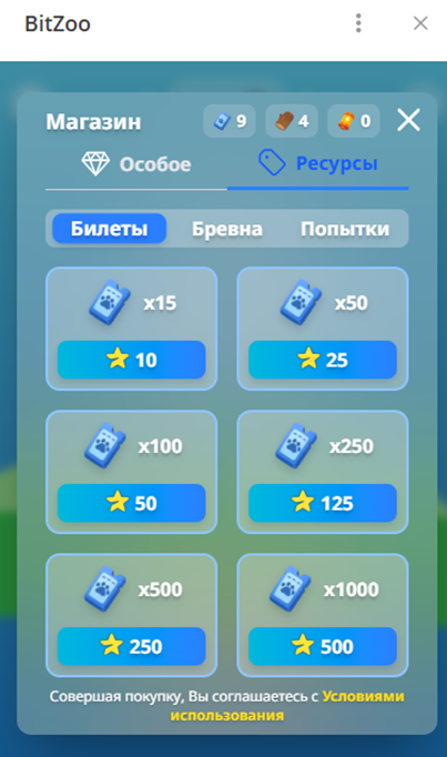 В магазине можно купить билеты для новых экспедиций, строительные материалы и бонусы. Валюта для покупки – звезды Телеграм Premium.