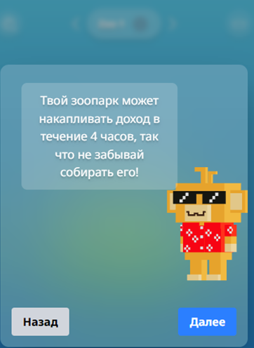 После запуска мини-приложения через Bitzooappbot игроки могут выбрать язык игры – английский или русский. Далее вас ждет небольшая инструкция, в которой сказано, что задача игрока отправляться в экспедиции, собирать ресурсы и животных, чтобы сформировать собственный зоопарк. Доход накапливается каждые 4 часа, поэтому нужно не забывать заходить в игру и собирать его.