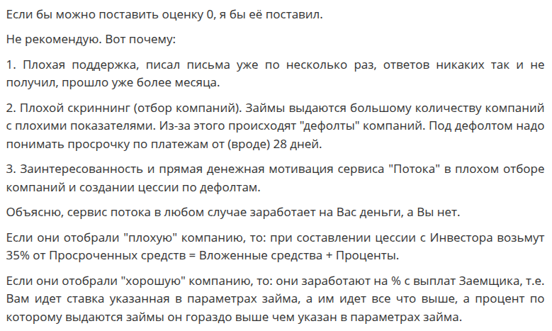 Основной же серьезный риск – дефолты. Малый и средний бизнес в России (как и во всем мире) – структура крайне нестабильная. Компании приходят за деньгами на подобные платформы, потому что не могут взять в долг в обычном банке из-за высоких рисков или плохой кредитной истории. «Поток Диджитал Инвестор» заявляет о собственной системе скоринга (оценки надежности), но судя по количеству дефолтов работает она не слишком эффективно.