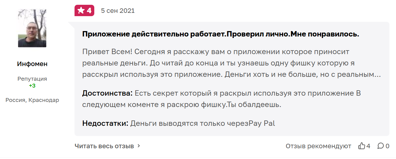 В положительных отзывах о Cash em All Play Win пользователи отмечают стабильную работу приложения. Они заявляют о возможности получения реальных денег.