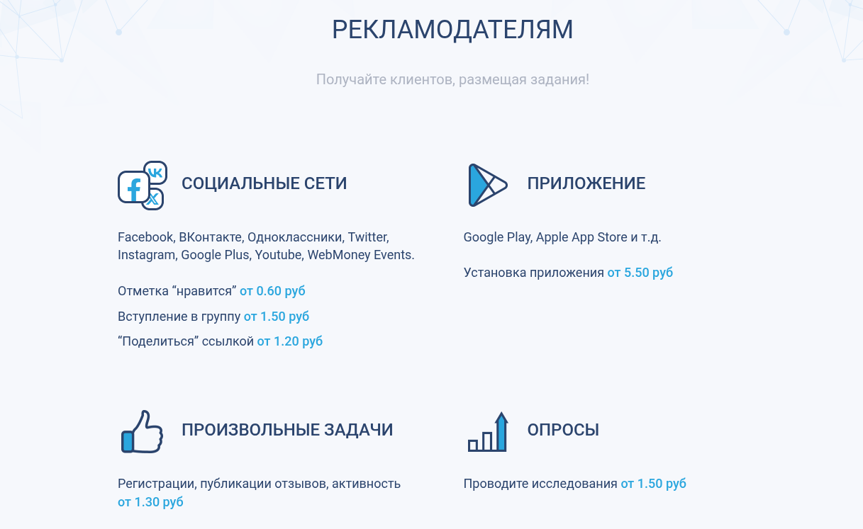 - Рекламодателям они предлагают продвижение в соцсетях (лайки, репосты, вступления в группы), установку мобильных приложений и выполнение произвольных задач. Ценник стартует от смешных цифр: лайк от 0.60 руб., скачивание приложения от 5.50 рублей.