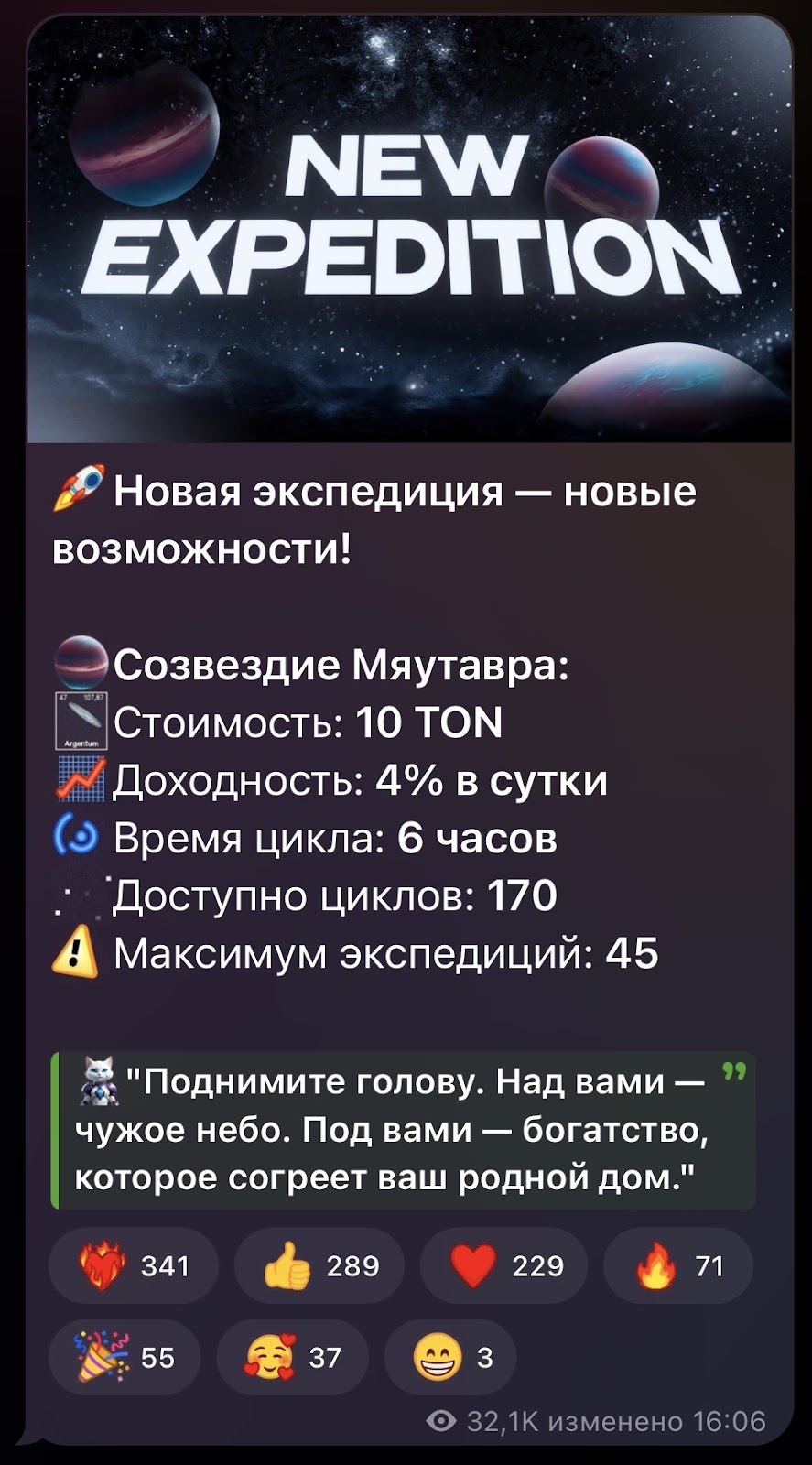 Все это делалось с одной целью — заработать на инвестициях. Вкладываете Телеграм Старс или токены TON и получаете по несколько процентов сутки.При этом установлен лимит — минимальная сумма взноса составляет 1 TON. И чем больше вы готовы вложить, тем выше будет процент начислений. Все это оформляется в виде той самой экспедиции: