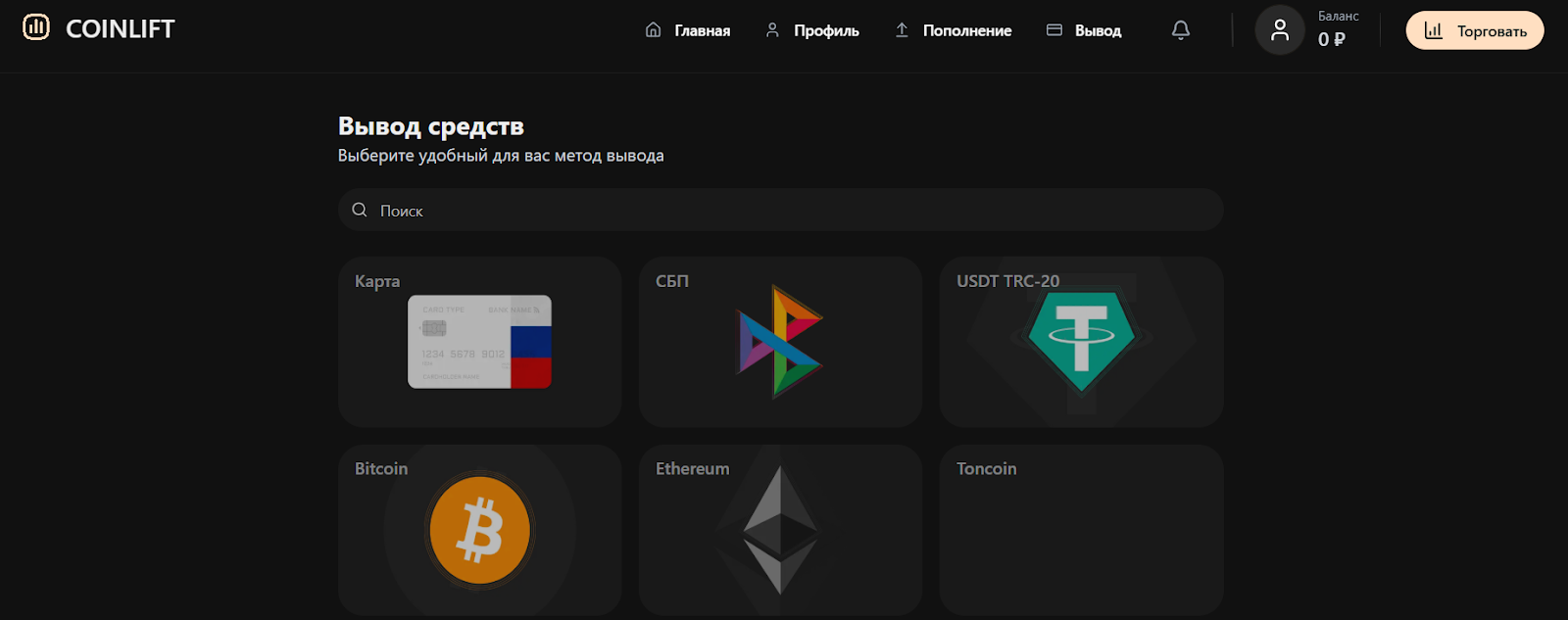 Способы пополнения и вывода выглядят так, будто перед пользователем полноценная биржа: на экране предлагаются карты российских банков, СБП, криптовалюты вроде Bitcoin, Ethereum, USDT TRC-20 и Toncoin.