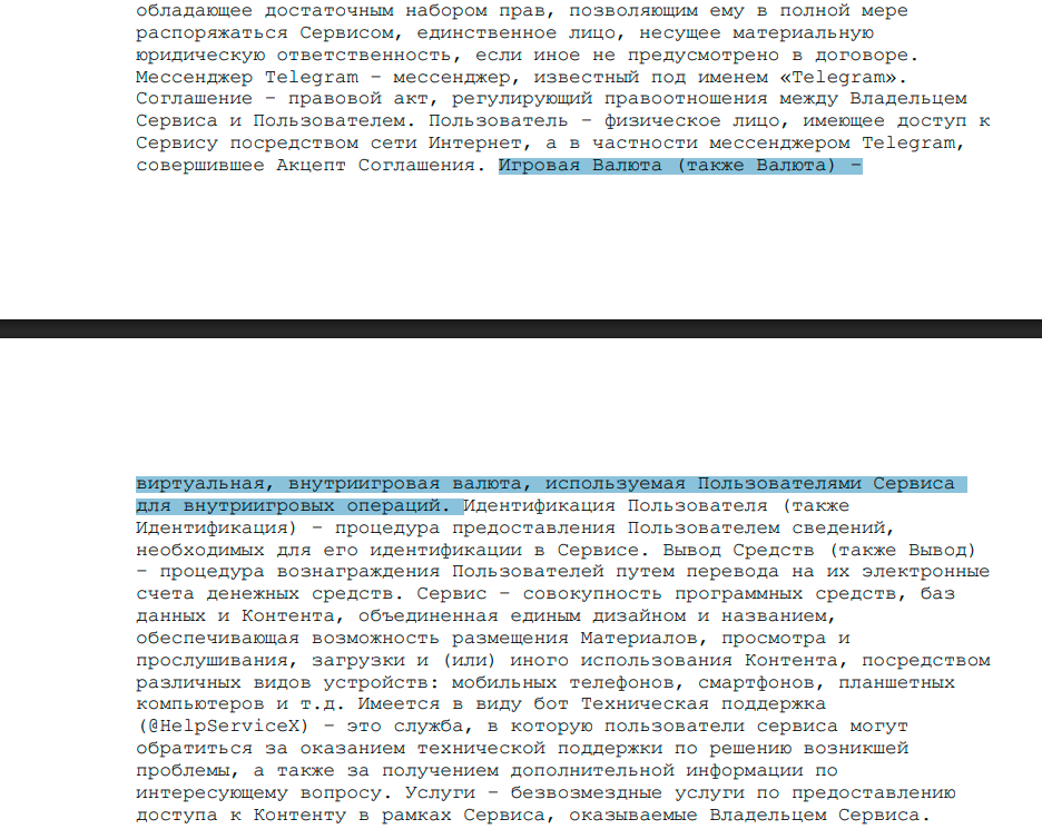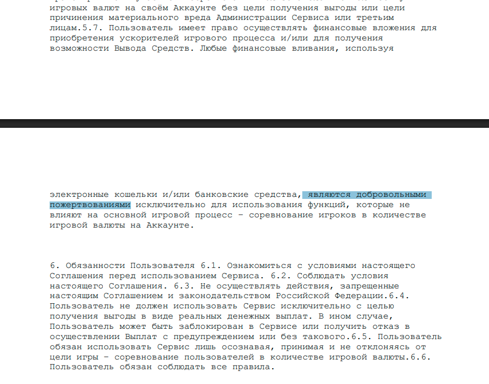 Внутри документа нет ничего о брокерской лицензии, стандартах безопасности, ответственности за хранение средств, не указана юрлица, нет адреса, нет реквизитов, нет налоговой информации. Зато подробно прописано, что сервис создан как игра и что денежные операции это добровольные пожертвования, которые не подлежат возврату.