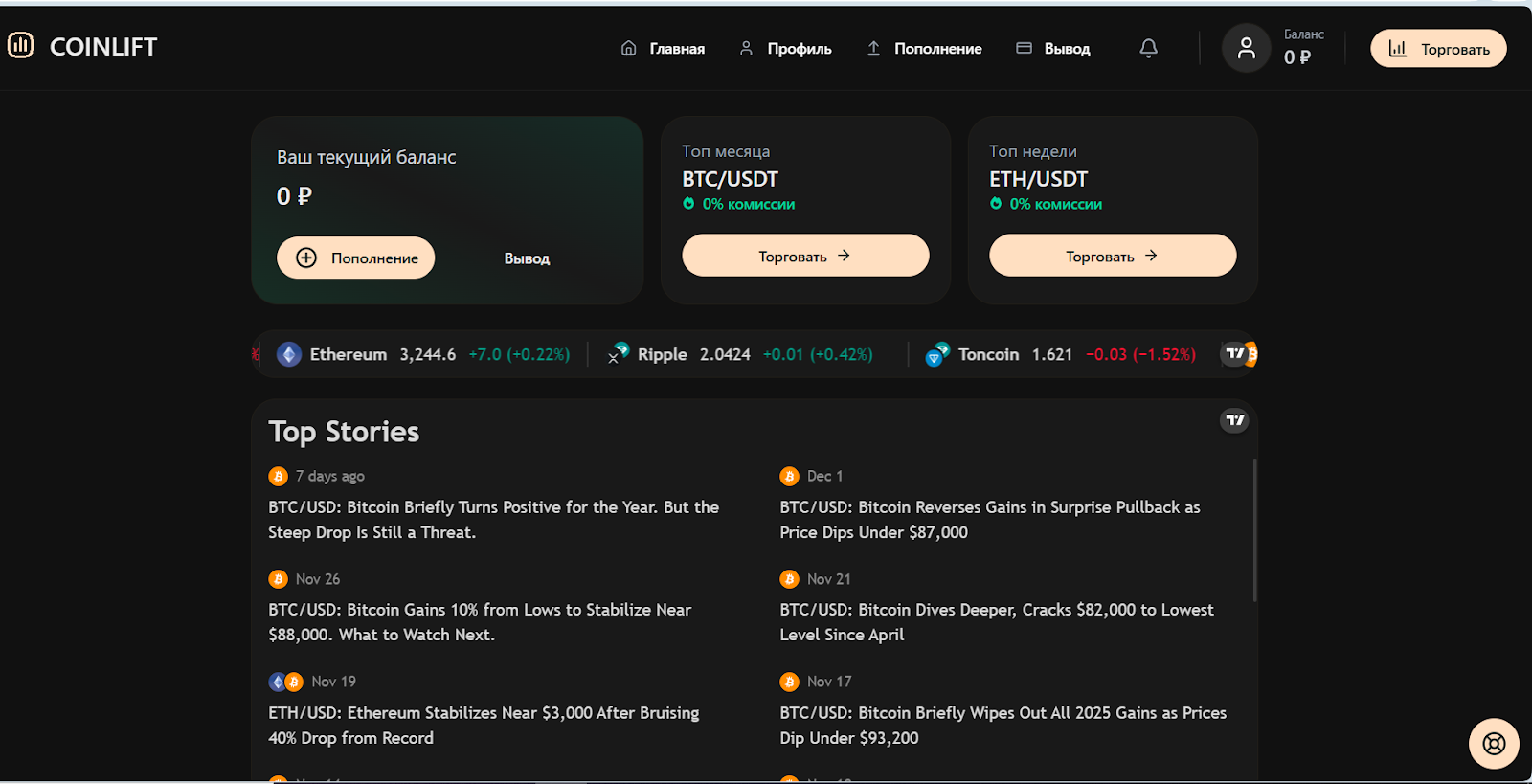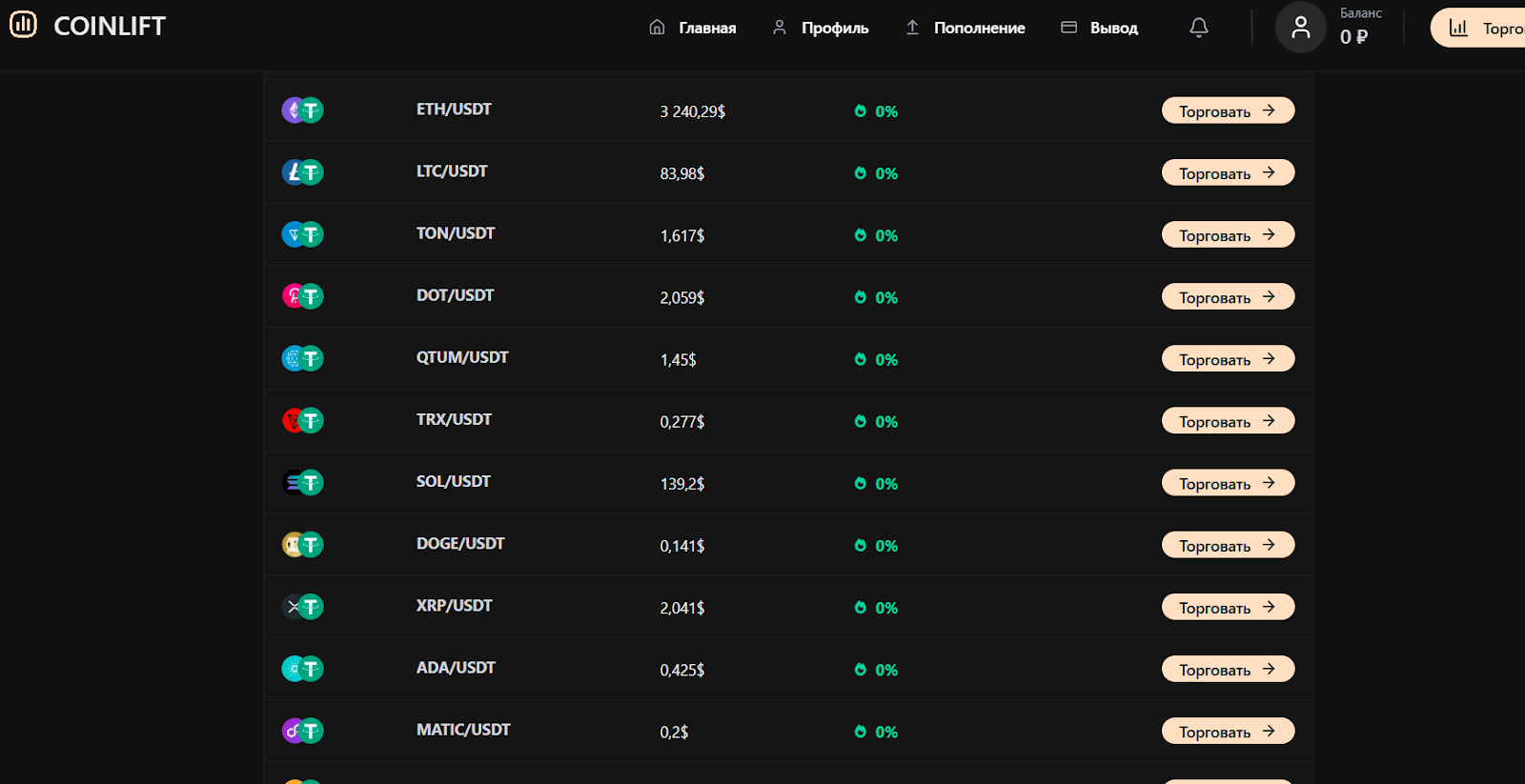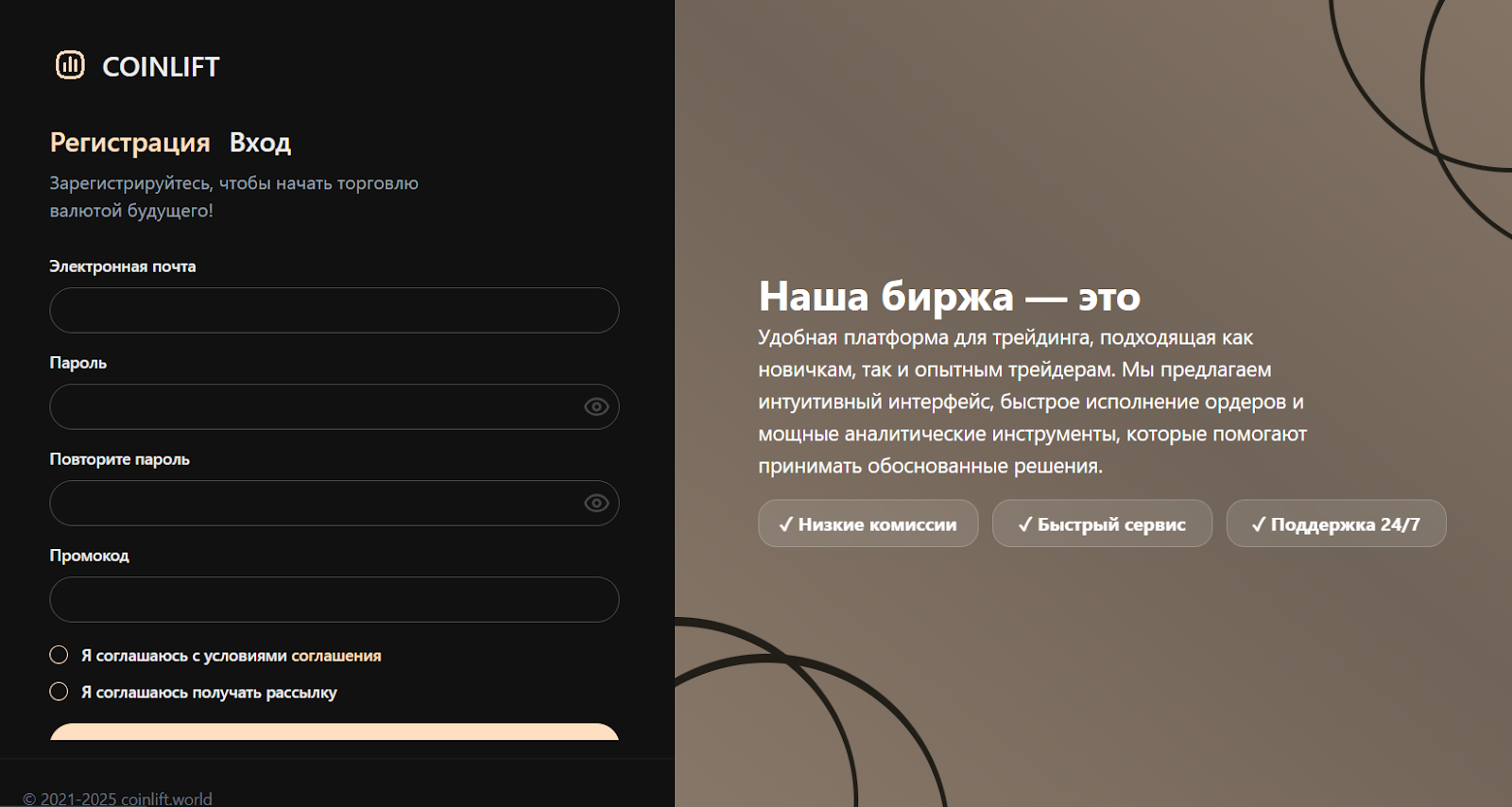 Coinlift World подает себя как современную крипто-платформу, где можно торговать цифровыми активами с минимальными комиссиями и получать быстрый доступ к рынку, при том что отзывов о ней в сети фактически нет.