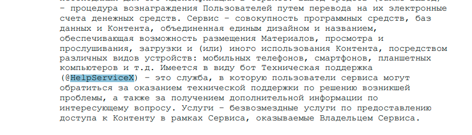 На сайте указана поддержка @HelpManagerX, а внутри пользовательского соглашения обнаруживается ссылка на иной технический аккаунт @HelpServiceX.