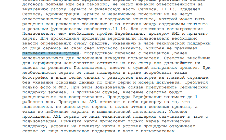 Также прописано требование к прохождению верификации и AML-проверки, которая проводится не автоматически, а посредством перевода дополнительных средств.