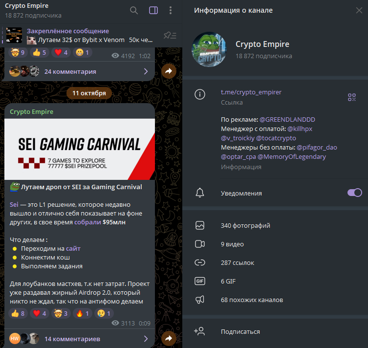 Crypto Empirer – экономическая игра и сообщество в Телеграм, объединяющее игроков p2E. Количество подписчиков 18,8 тысяч человек, активность повышенная. Но, в основном, это мультиаккеры и другие пользователи, связанные с криптой.