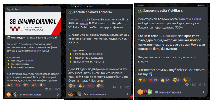 - на канале нет токеномики, аналитики или юридической информации, только яркие картинки, призывы пройти по ссылке с обещаниями сразу заработать;