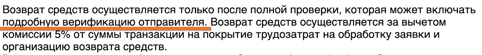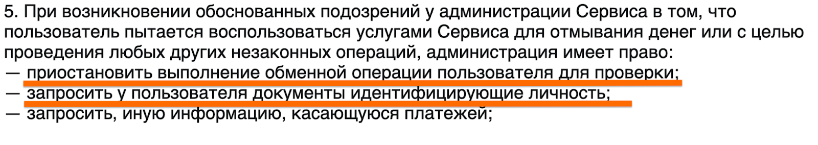 Подвох заметен и в условиях, прописанных в политике AML. Сервис может в любой момент заблокировать транзакцию, сославшись на «подозрения в отмывании денег». Это дает ему право заморозить средства клиента на неопределённый срок и потребовать у него личные документы. Даже если пользователь решит отменить операцию, сервис оставляет за собой право удерживать комиссию в 5% от суммы транзакции.