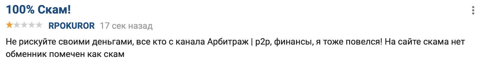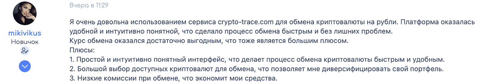 Среди вороха заказных мы нашли лишь один реальный отзыв на фейковый обменник. Искать комментарии на обменник Crypto-Trace бесполезно.