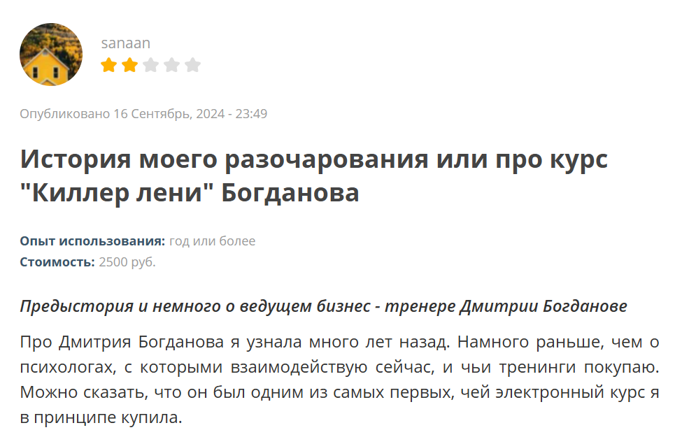 При рассмотрении того, какие Дмитрий Богданов отзывы получил на внешних источниках, можно отметить, что многие остаются недовольными качеством обучения. Много негативных откликов говорит о том, что обещанные результаты не достигаются, а рассматриваемый материал оказывается бесполезным. Поэтому достаточно многие клиенты указывают, что Дмитрий Богданов – инфоциган.