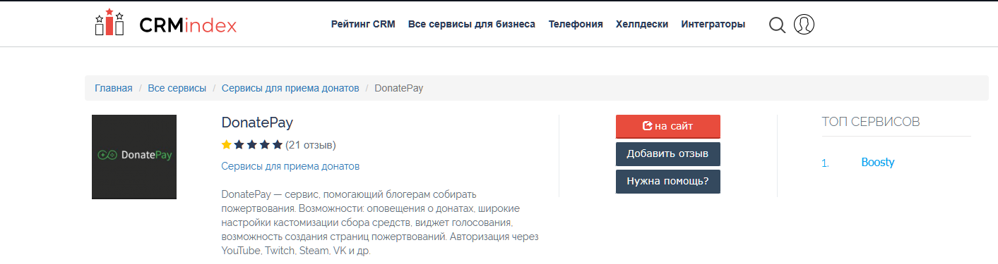 Рейтинг у этого сервиса на CRM Index низкий, всего одна звезда. Лидирует среди платежных систем для приема донатов Boosty.