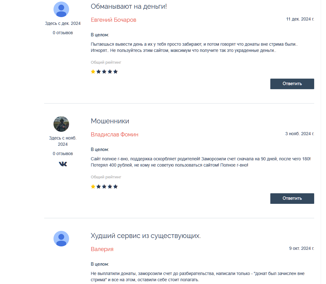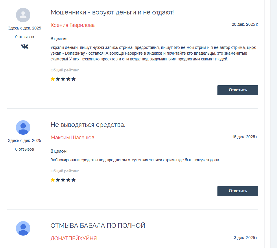 Про сервис DonatePay за 2025 и начало 2026 года появилось очень много негативных отзывов от недовольных пользователей. Блогеры пишут, что не могут вывести средства, деньги блокируют на три месяца, требуют подтверждать, что пожертвования поступили во время стрима.