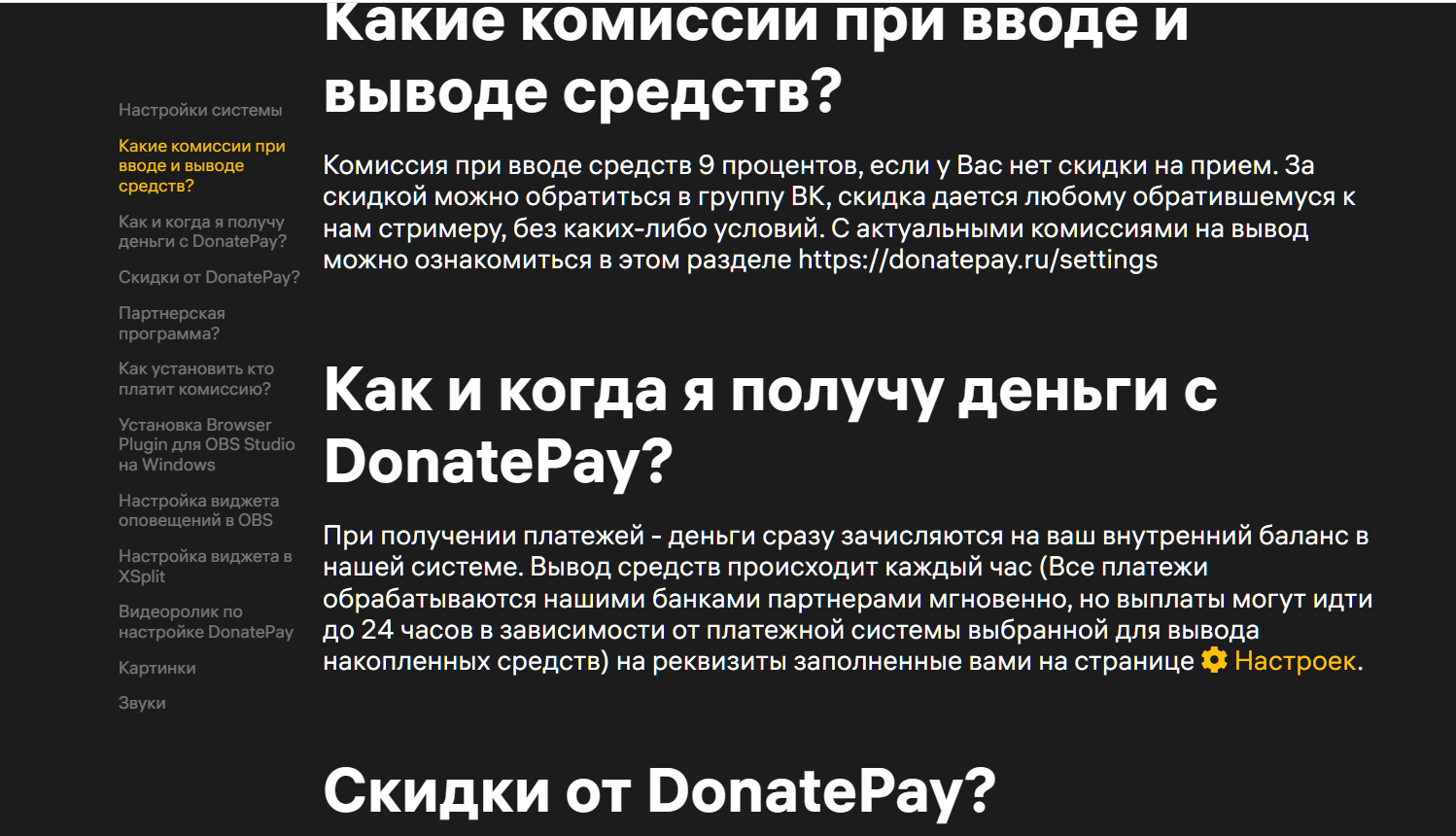 На сайте платформы нет прозрачной информации, какая Donate Pay комиссия начисляется при выводе заработка блогера денег через разные платежные системы. Удалось найти крайне расплывчатую информацию про комиссионные сборы системы на вкладке вопросов и ответов на сайте.