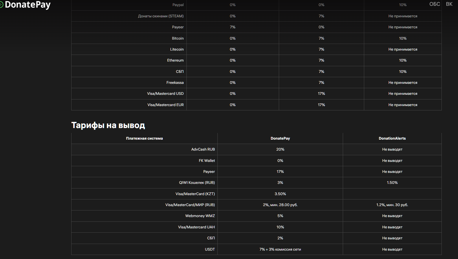 В рекламных постах сервиса часто указываются неверные характеристики. Например, в таблице сравнения DonatePay или DonationAlerts, что лучше, сказано, что «Донат пей» не берет комиссии за вывод, но это не так.