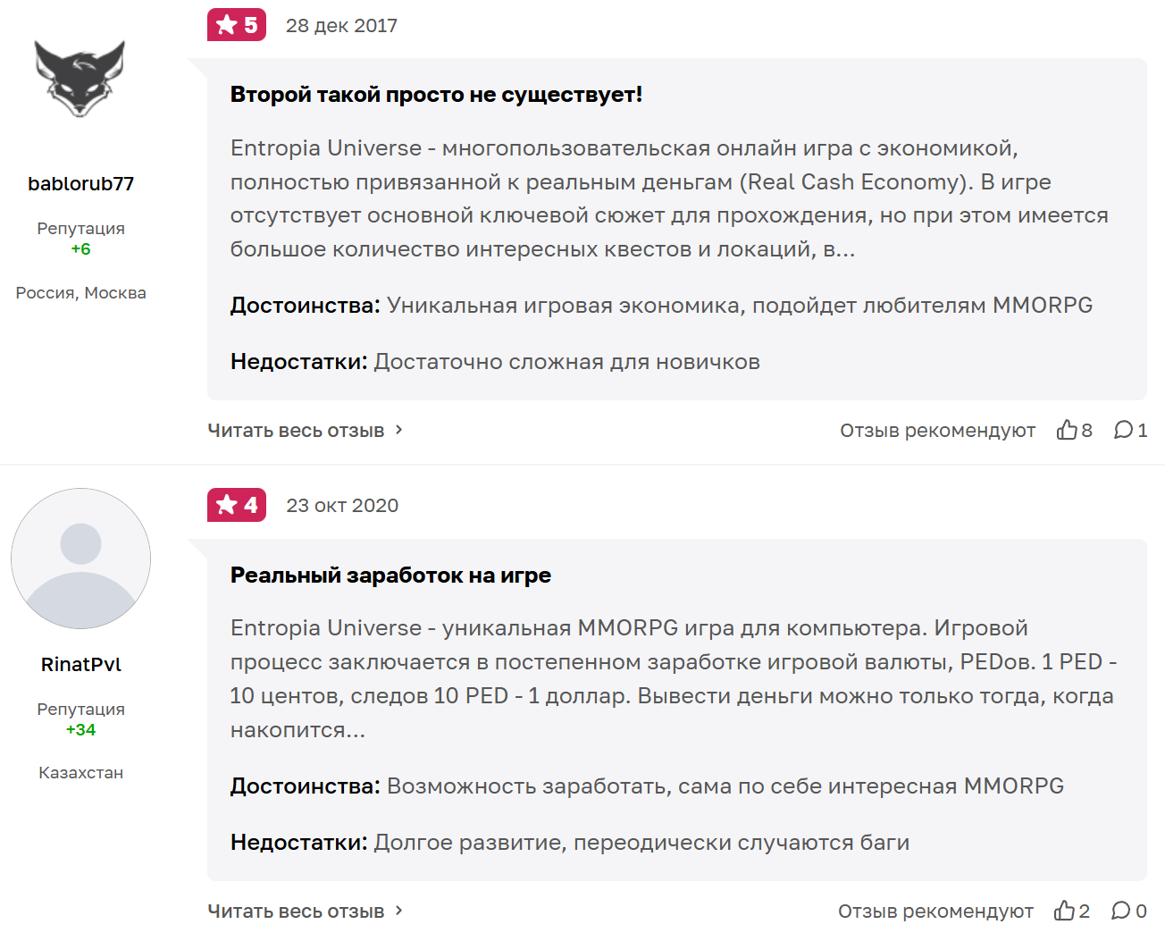 - наличие негативных отзывов о Entropia Universe;
