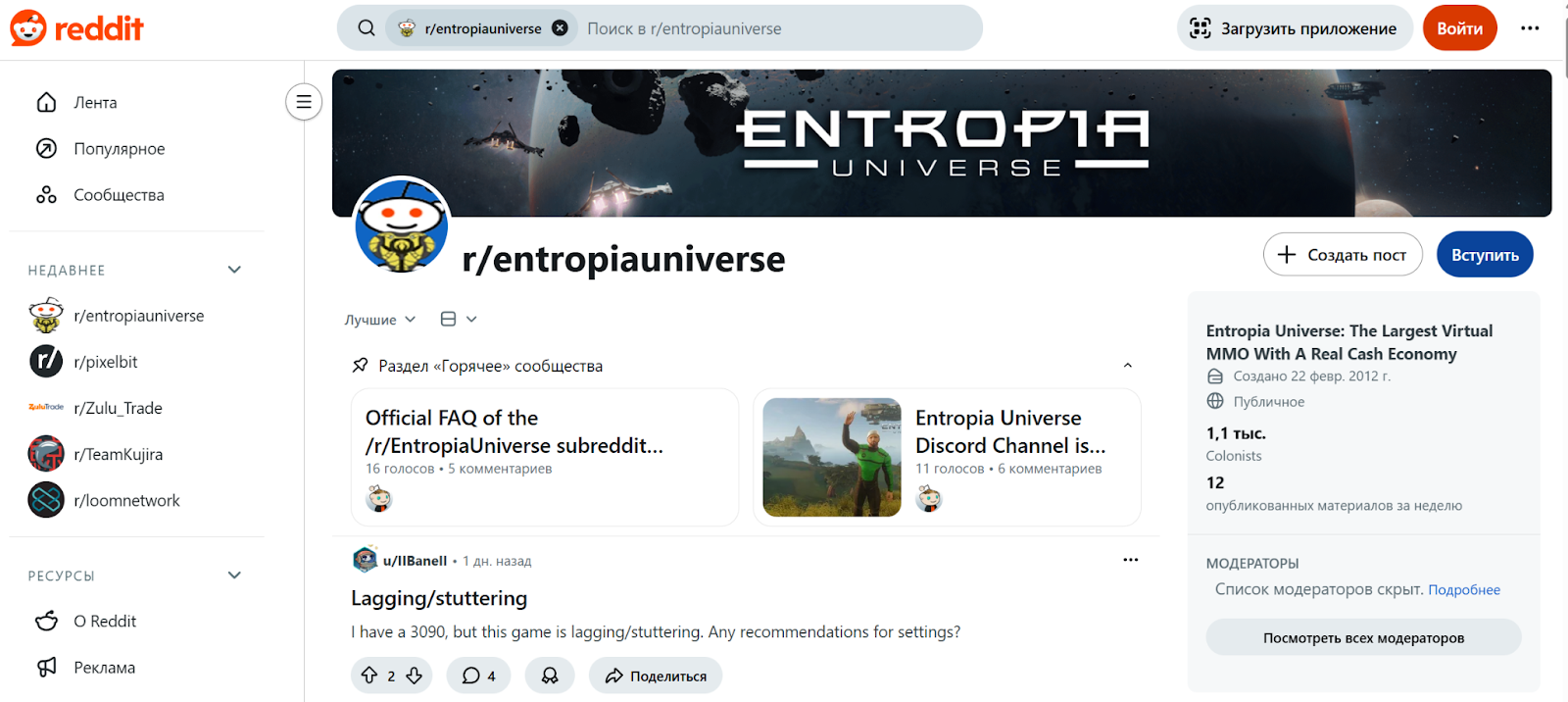 - Реддит — entropiauniverse. Это сообщество сумело собрать около 1,1 тыс. человек. Здесь можно найти обсуждения платформы и ее особенности.