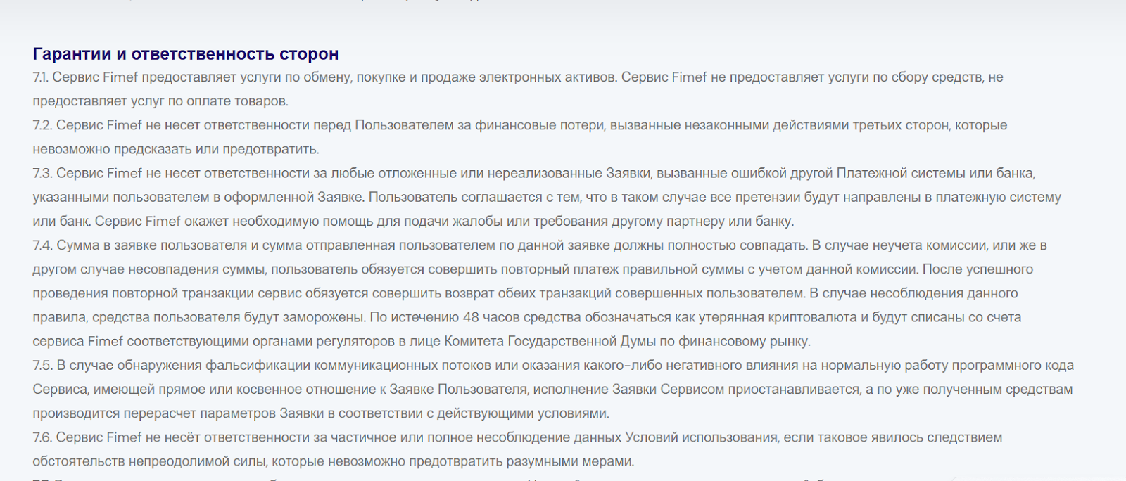 Также советуем внимательно прочитать «Правила». Администрация Fimef частично снимает с себя ответственность за убытки клиентов. Также она оставляет за собой право собирать и распространять персональные данные. А при регистрации надо предоставить имя, номер телефона и кошелька, это небезопасно.