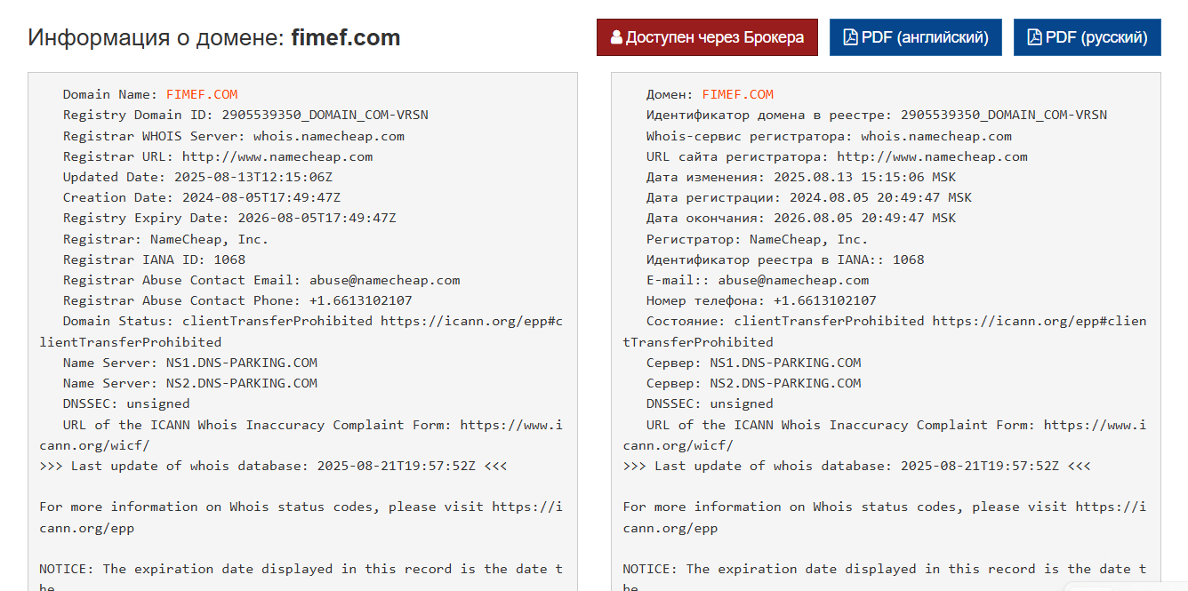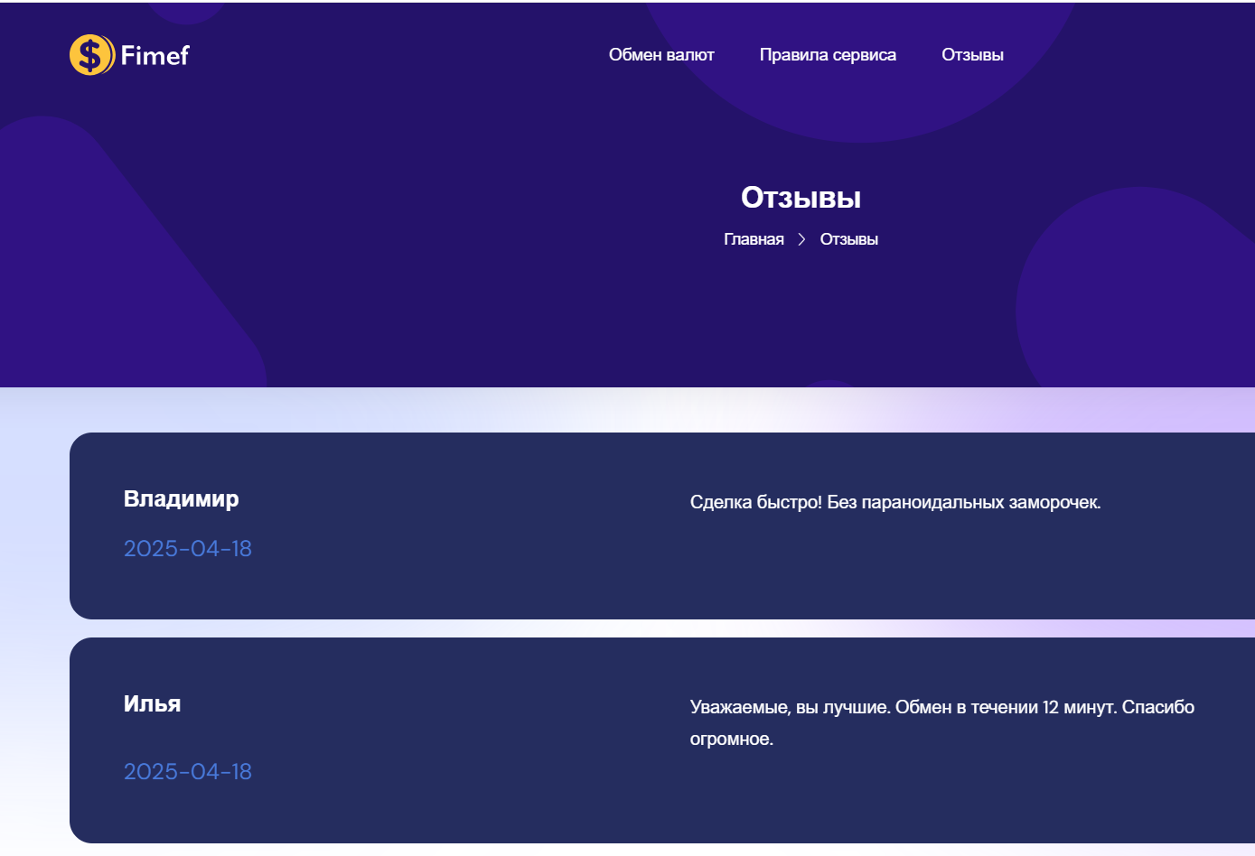 Домен компании зарегистрирован в августе 2024 года. Получается, ему около года. Даже если обменник Fimef работает все это время, это все равно не очень большой срок для финансовой организации.