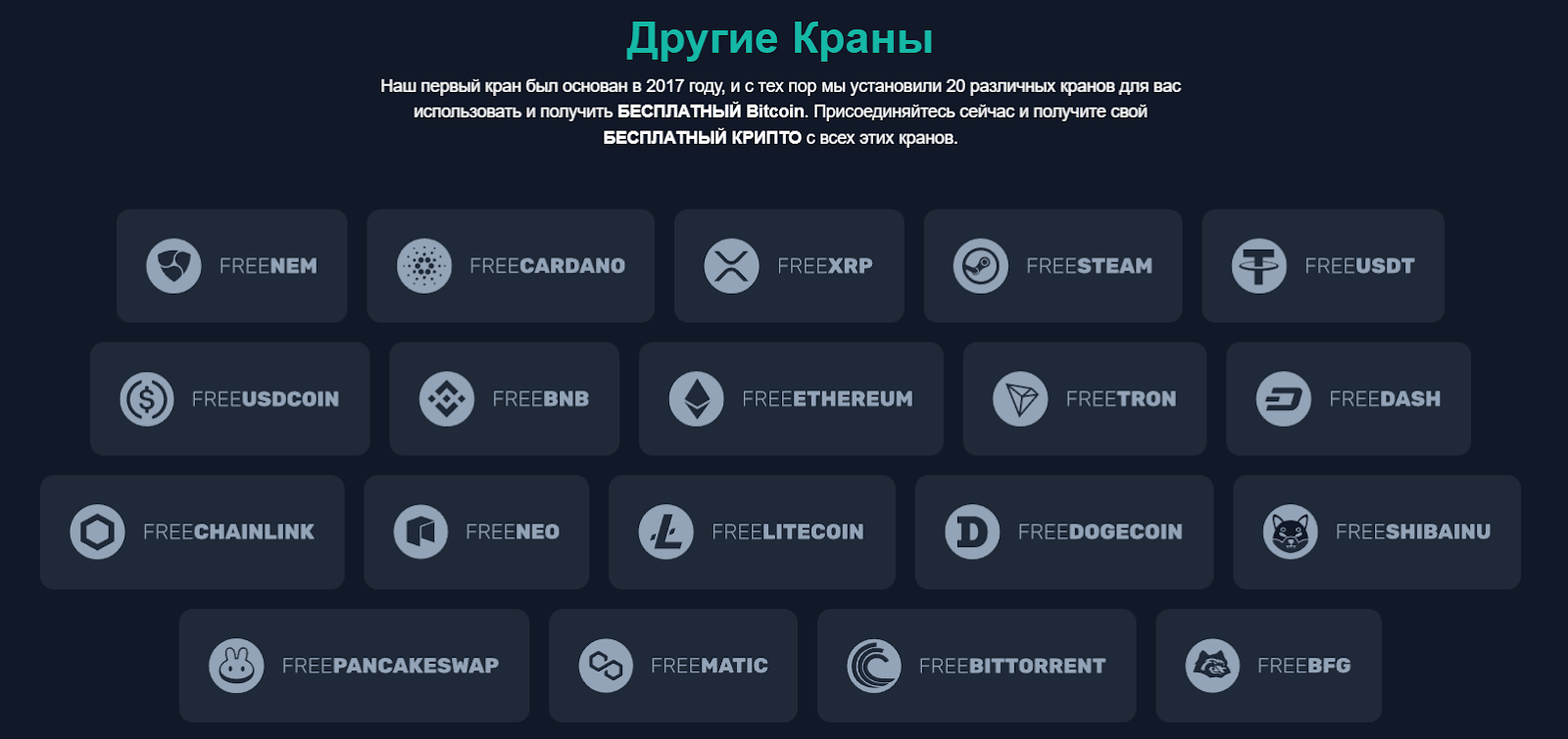 Небольшого внимания стоит упоминание того, что это не единственный проект по раздачам криптовалюты от команды Free Cryptos. По такому же шаблону созданы платформы: FreeUSDT, FreeBND, FreeEthereum, FreeTron и другие.