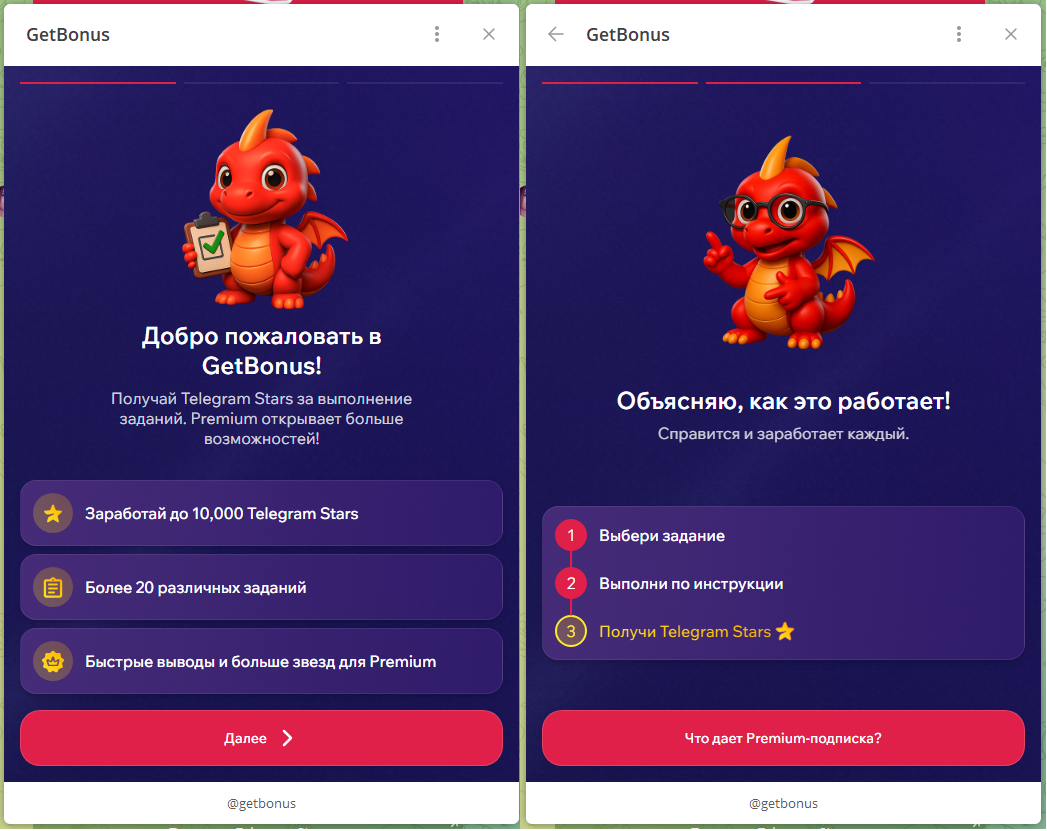 Бот работает через приложение Getbonus Mini App. При первом запуске на экране появляются небольшие инструкции. В них пишут, что пользователи могут заработать до 10 тыс. Telegram Star, выполняя несложные задания.