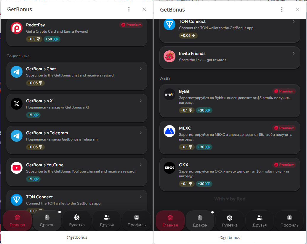 Дополнительные бонусы внутри приложения Getbonus Mini App