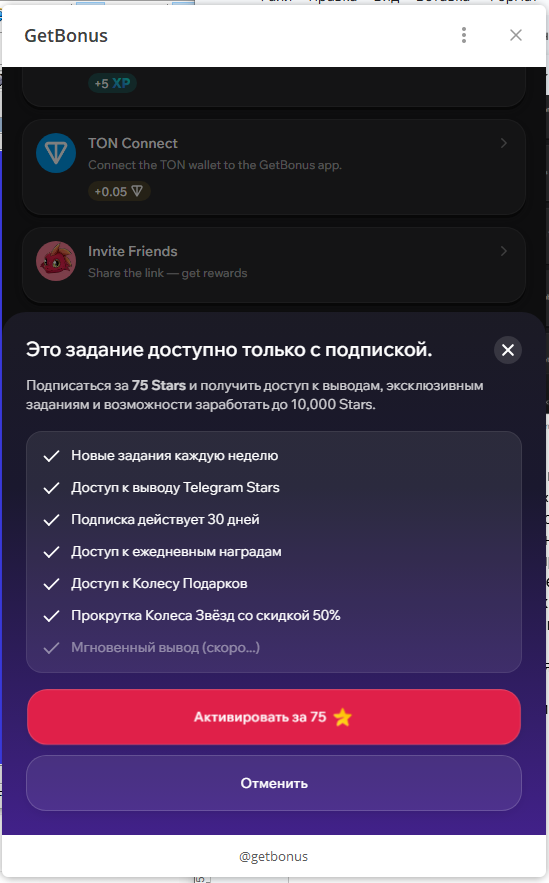 Вывод о работе приложения для заработка Telegram Stars Getbonusappbot
