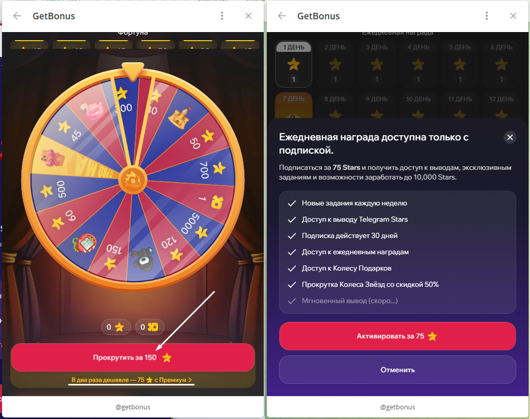 Внутри бота есть два колеса фортуны: один для получения призов в виде звезд, другой — для NFT-подарков. Но для запуска спина система требует завести премиум-аккаунт, если его нет, появляется сообщение с предложением его купить. Что опять приводит пользователя к необходимости платить, а не получать доход.