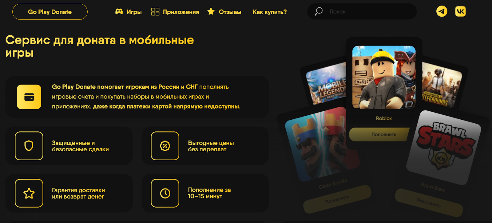 Go Play Donate в ТГ – сервис покупки игрового контента. Компания помогает любителям мобильных игр из нашего региона и соседних стран пополнять счета и приобретать наборы в играх, даже если напрямую оплата с карты в сервисе недоступна. Платформа goplaydonate ru охватывает огромное количество игр и приложений, так что воспользоваться качественным сервисом может практически каждый пользователь.