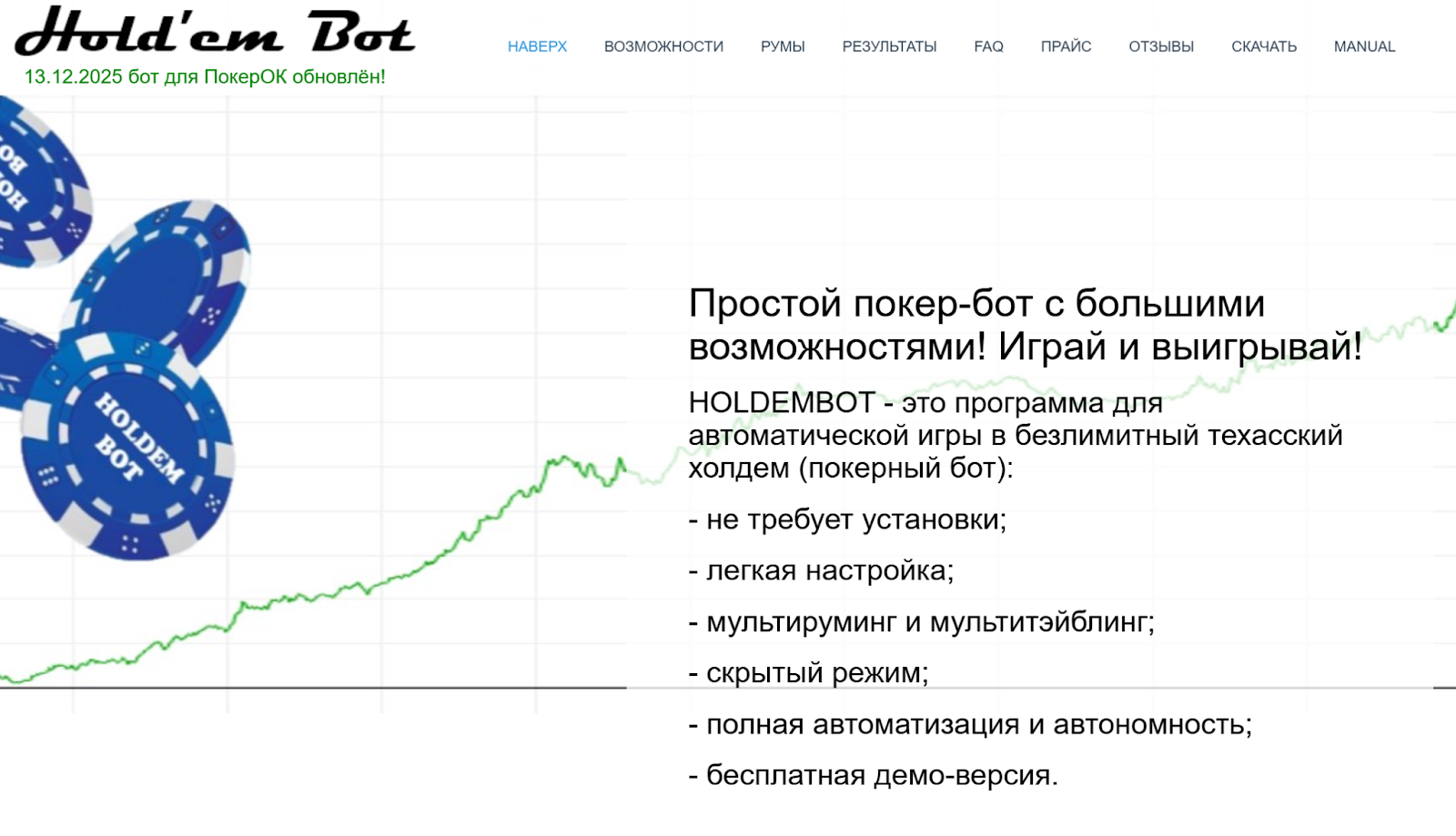 Полные сведения о боте для автоматизированной торговли доступны по ссылке holdembot ru. Здесь можно найти ссылку для скачивания демо-версии и подробную инструкцию для новичков. Разработчики заявляют, что пробный вариант имеет ограниченный функционал и создан только для общего ознакомления.