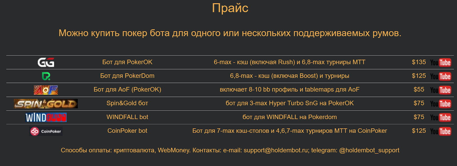Стоимость бота Holdem Bot зависит от количества поддерживаемых румов и характеристик. В большинстве случаев цена находится в диапазоне от 55 до 135 USD. После проведения платежа версия для установки отправляется на электронную почту.