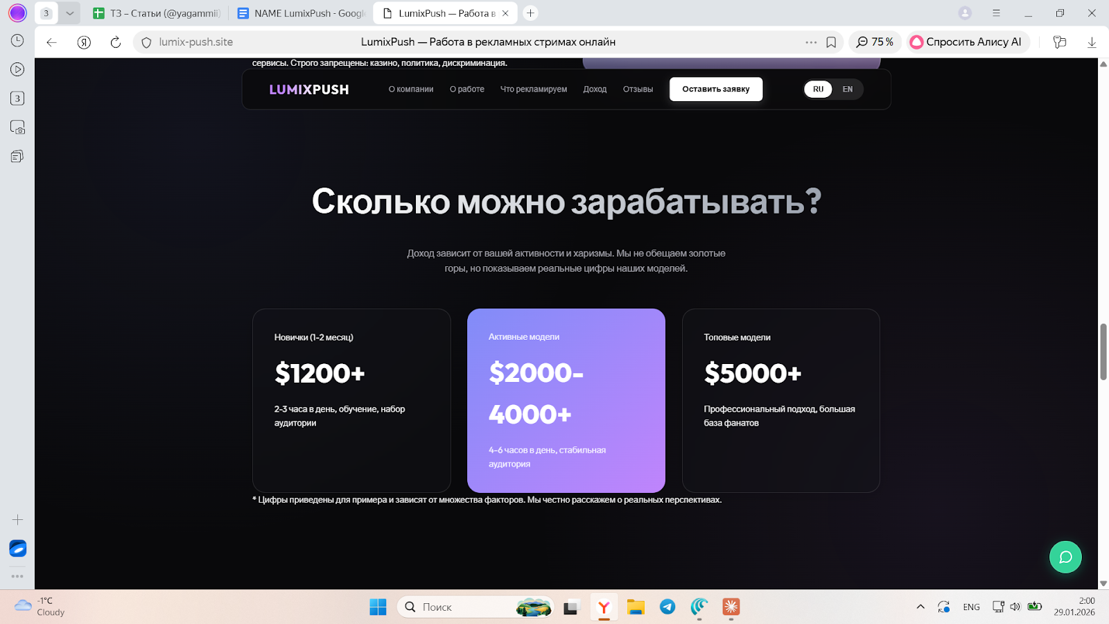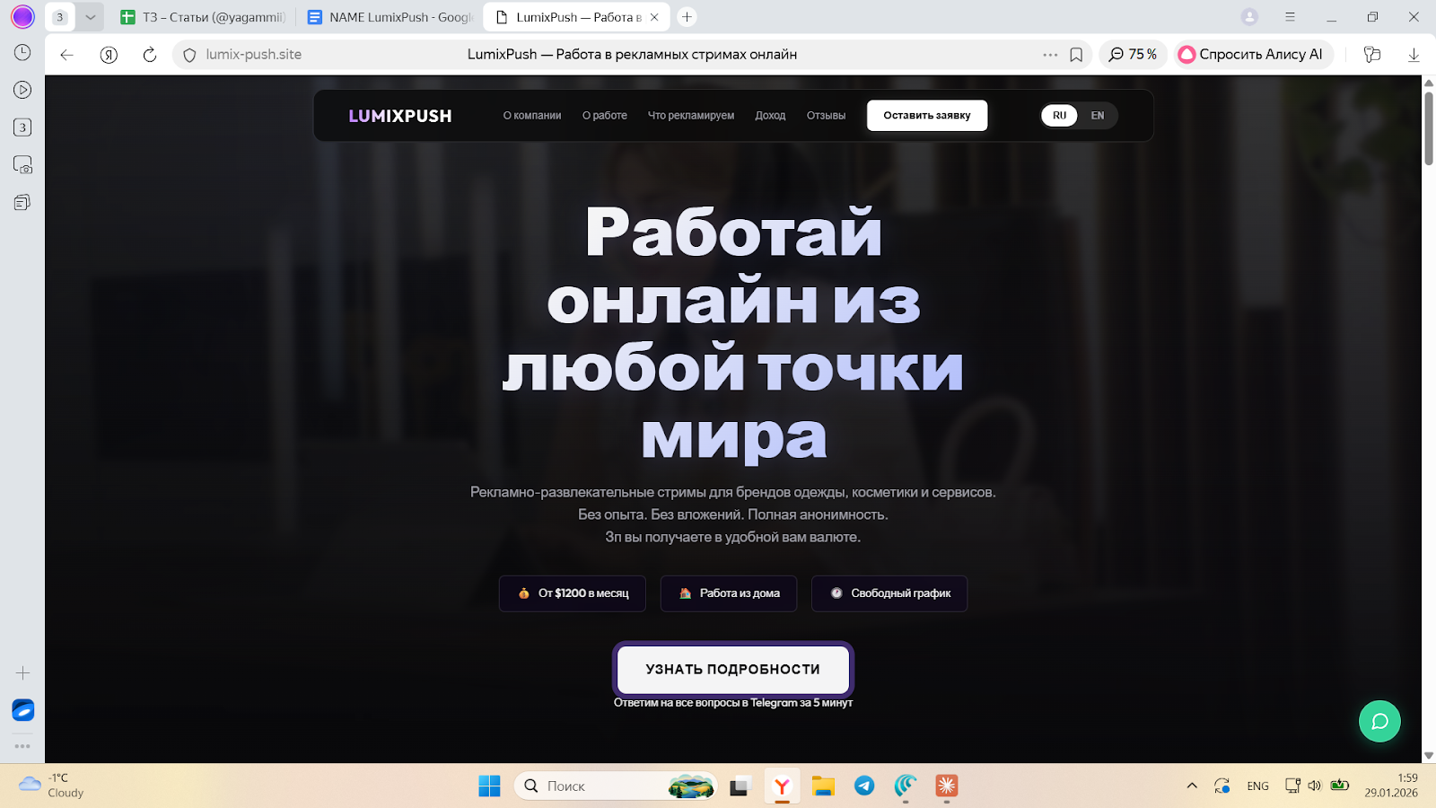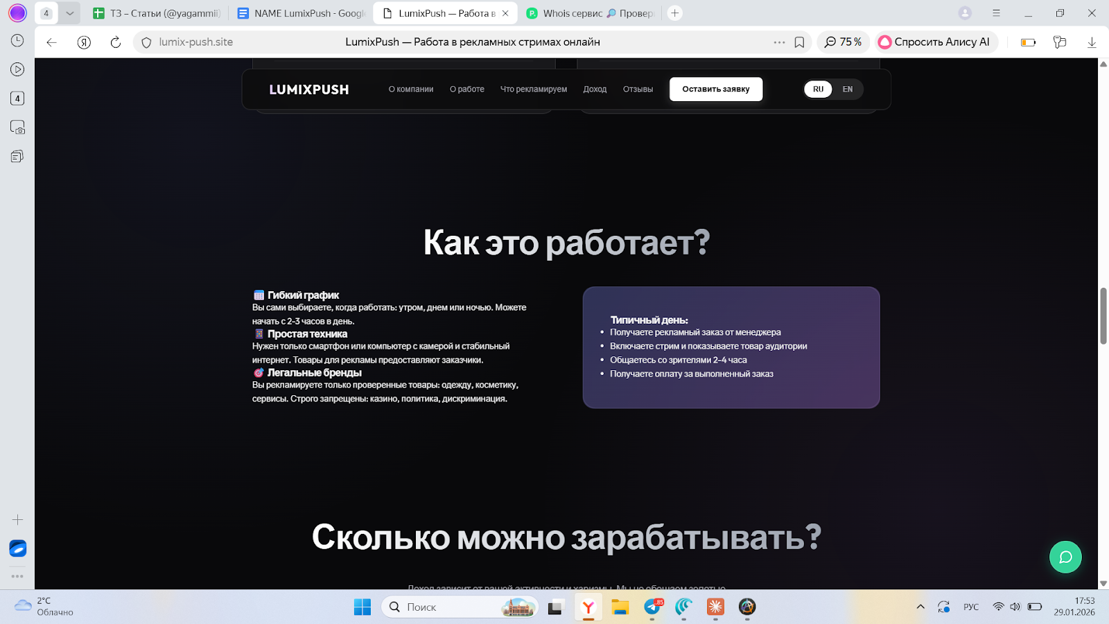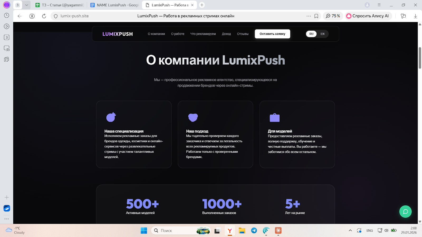 Lumix Push Site — сервис для заработка из дома со свободным графиком. Пользователей бесплатно обучают вести рекламные стримы для различных брендов, магазинов косметики и одежды. Доход моделей в компании зависит от опыта работы. Компания LUMIX находится на рынке более 5-ти лет.