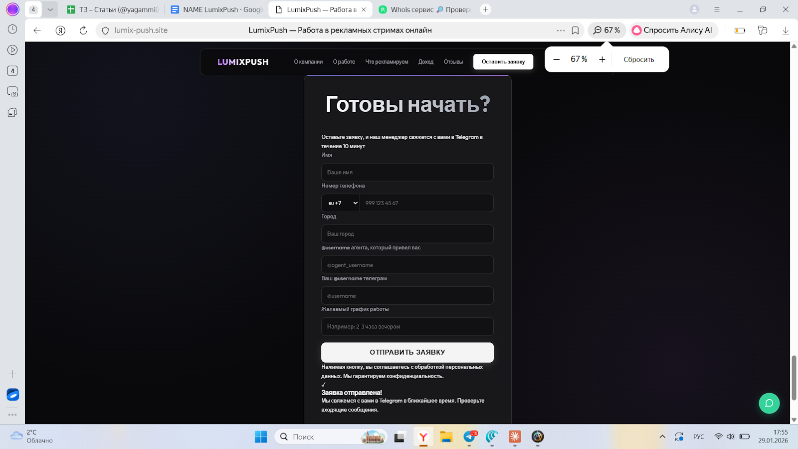 Для старта работы необходимо заполнить специальную форму на сайте. Пользователь должен указать: имя, номер телефона, город, ник в телеграм и желаемый график. Также в заявке присутствует строка «Юзернейм агента, который привел вас», что указывает на наличие реферальной программы. Но ее подробности неизвестны. После подачи формы на связь выйдет менеджер в телеграм.График работы гибкий, неважно в какое время суток будет проведен стрим. Модель должна иметь смартфон или компьютер с камерой, все товары для рекламы предоставляются заказчиками. Авторы указывают, что оплата за заказ происходит только после общения со зрителями. Однако, полные условия выплат неизвестны.