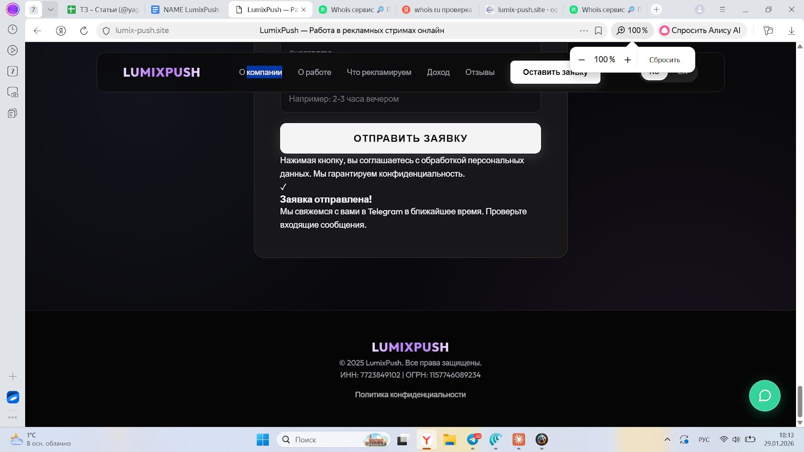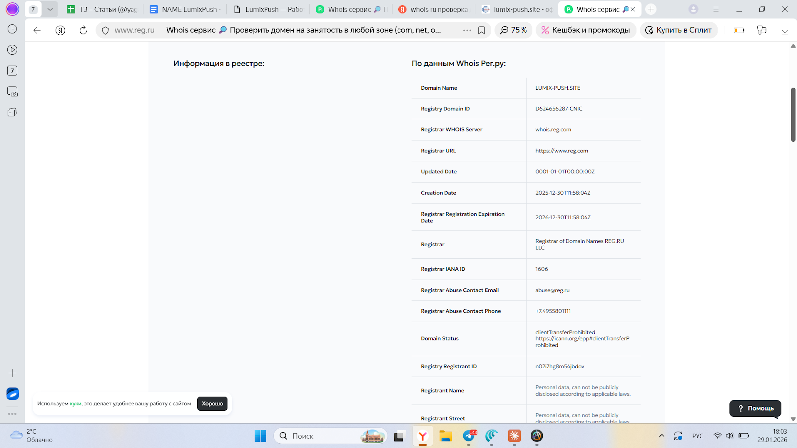 По данным проверки сайта сервисом Whois на Reg.ru мы выяснили, что домен был зарегистрирован 30 декабря в 2025 году. Получается, что статистика, продвигаемая авторами может быть фейковой. Lumix Push Site существует всего месяц и не может существовать 5 лет, при этом иметь более 1000 тысячи выполненных заказов и свыше 500 работников.