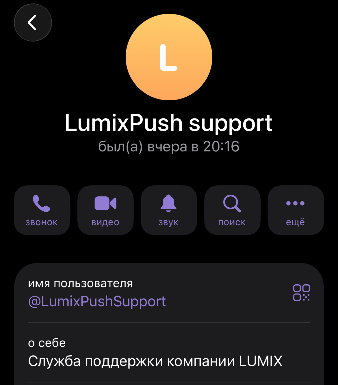 В качестве канала связи клиентам доступен лишь профиль поддержки в телеграм Lumixpushsupport. Непонятно, работает ли аккаунт на самом деле и отвечает ли на сообщения.