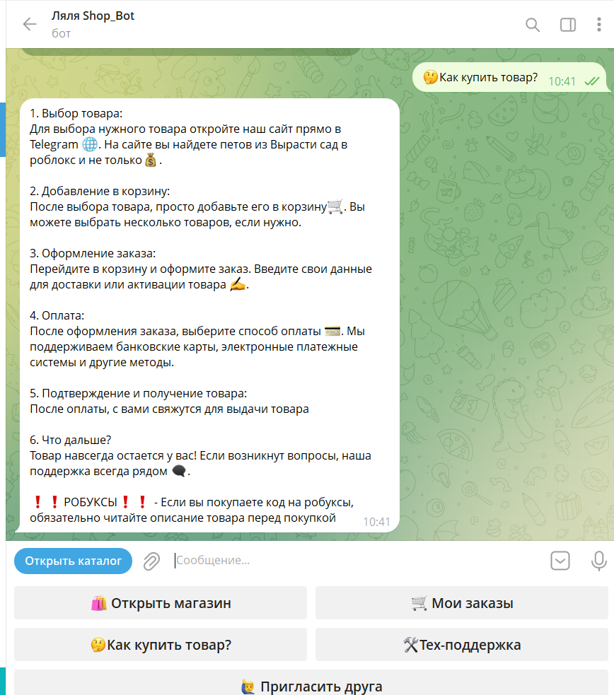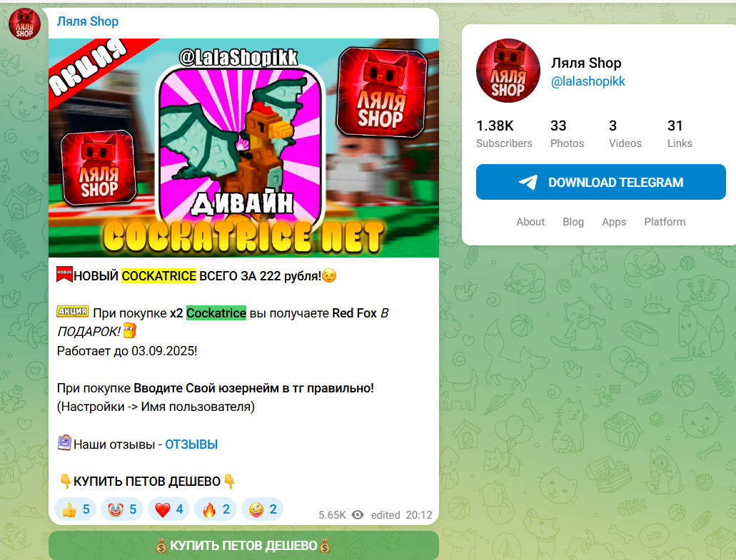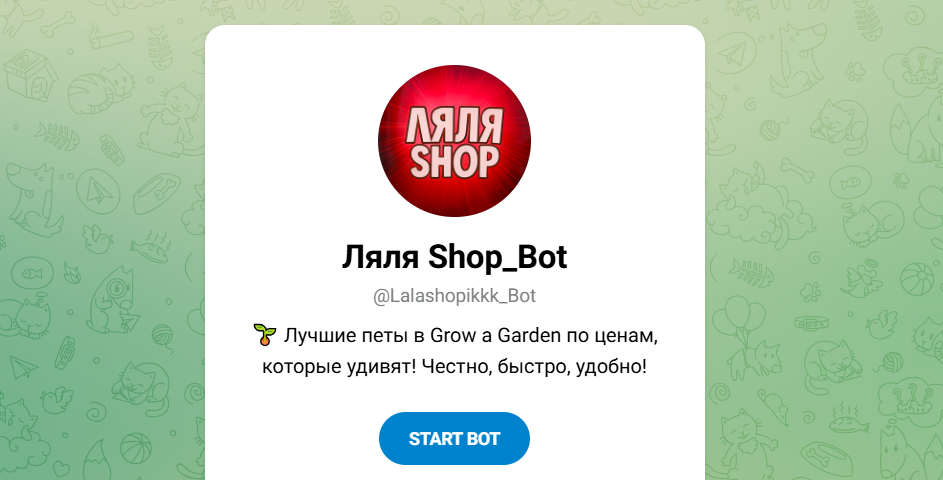 Магазин Ляля Шоп — это небольшой игровой сервис внутри тг, где продают петов, валюту и другие товары из популярных игр в роблоксе, делая упор на быстрый ответ, низкие цены и простую подачу.