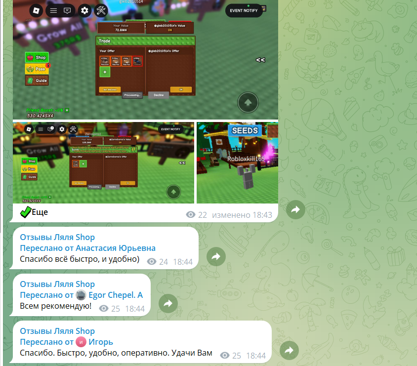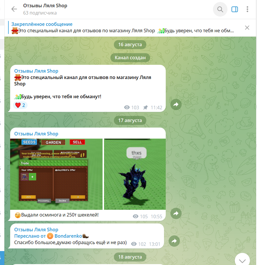 Отклики клиентов собраны в отдельном канале, где ежедневно появляются записи о выданных товарах. Люди подтверждают получение предметов, активацию сезон пассов, выдачу гемов, аккаунтов и разных редких петов.