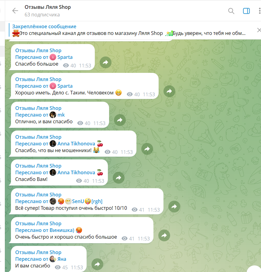 Отдельные покупатели говорят, что рады промокоду, участвовали в розыгрышах и выиграли призы. Ляля Шоп — телеграм канал содержит несколько отзывов о выдаче сложных наборов предметов, что косвенно подтверждает, что магазин действительно работает с реальными инвентарями.