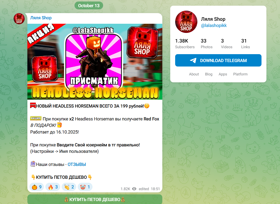 Однако у проекта нет официальной регистрации, юридического лица или прозрачной информации о том, кто именно стоит за магазином. На фоне того, что Roblox-маркетинг серый и никак не регулируется, подобный формат считается стандартом для маленьких игровых магазинов в тг.