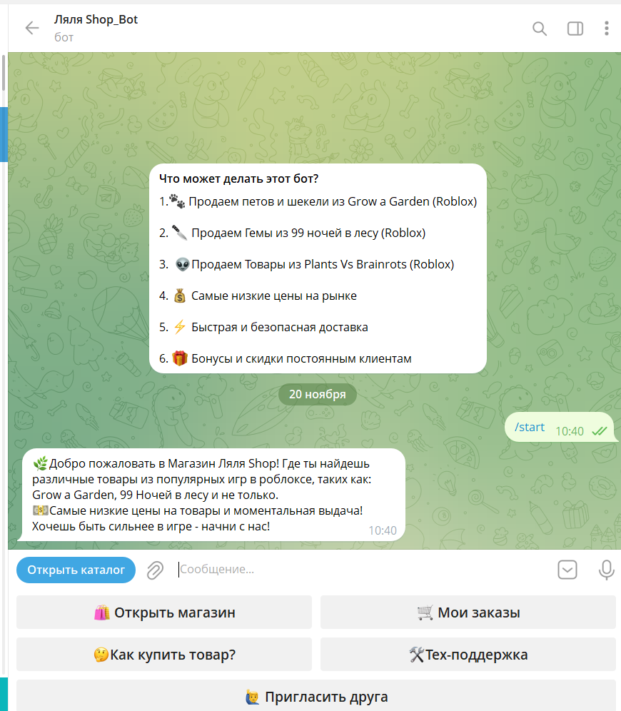 Открыв бота @Lalashopikkk Bot, сразу видно основные направления: петы и шекели из Grow a Garden, гемы из 99 Ночей в лесу, товары из Plants Vs Brainrots и другие популярные игровые предметы.