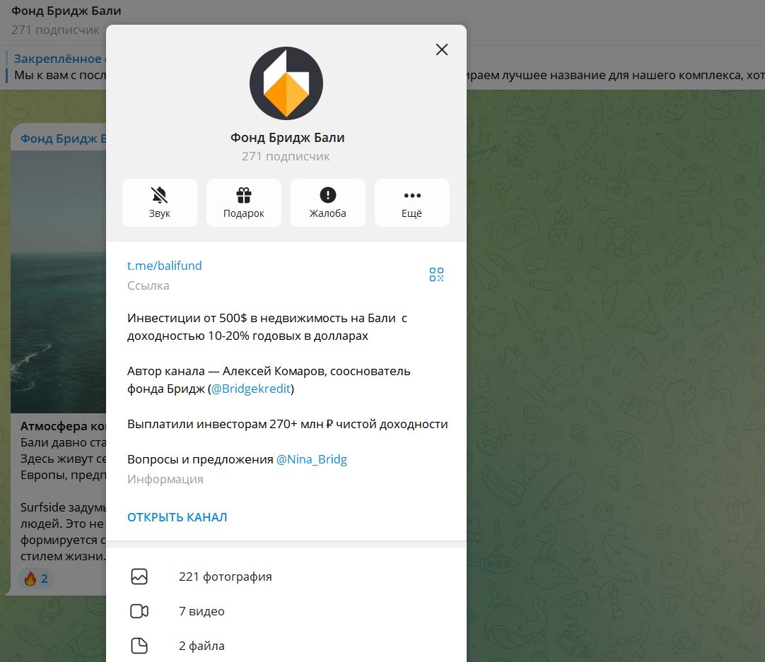 2. BaliFund (@balifund) — здесь 270 подписчиков, канал работает с 2019 года. Максим Федотов в этом Телеграм-канале делает акцент на работу с недвижимостью на Бали. Проект в ТГ ему помогает вести соучредитель компании — Алексей Комаров.