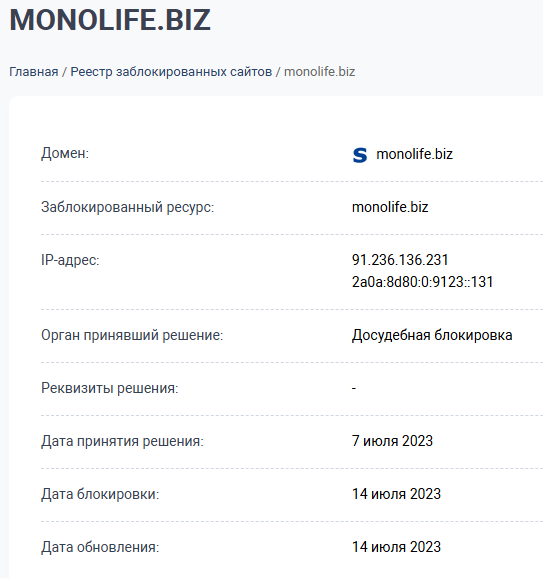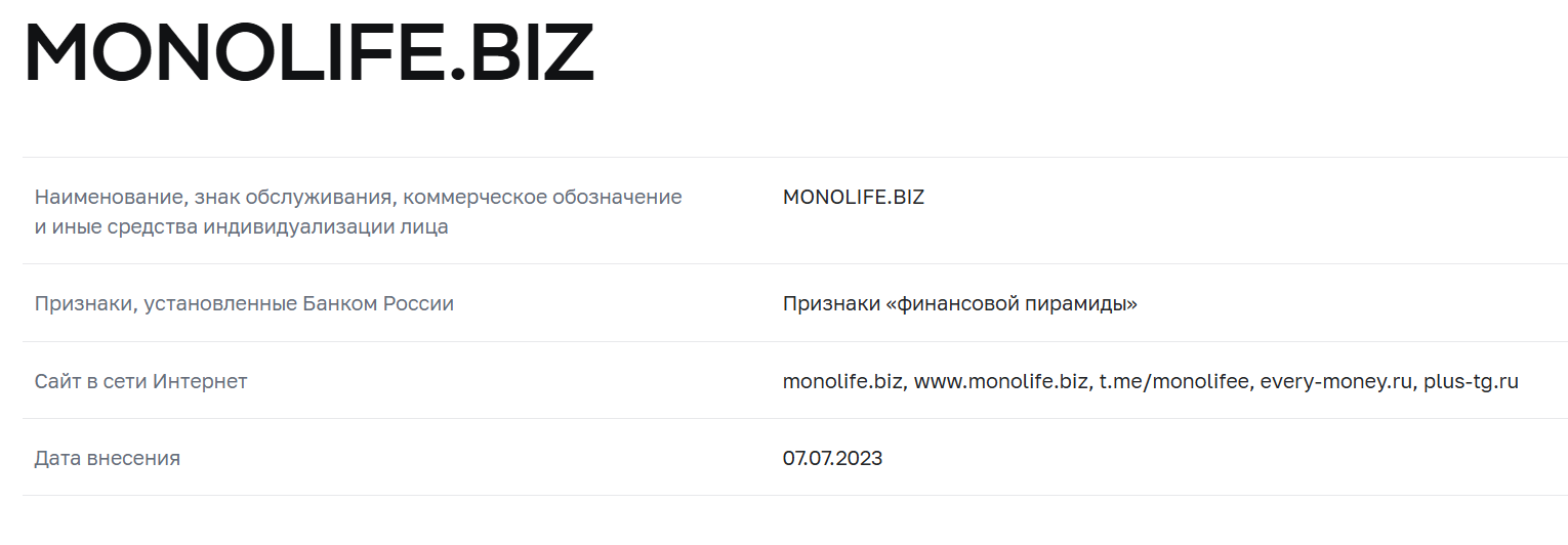 ЦБ РФ 7 июля 2023 года внес сервис в черный список. Признаки финансовой пирамиды были очевидны. Заблокировали все связанные ресурсы. Основной сайт monolife biz и дополнительные домены. Телеграм-канал monolifee тоже закрыли.