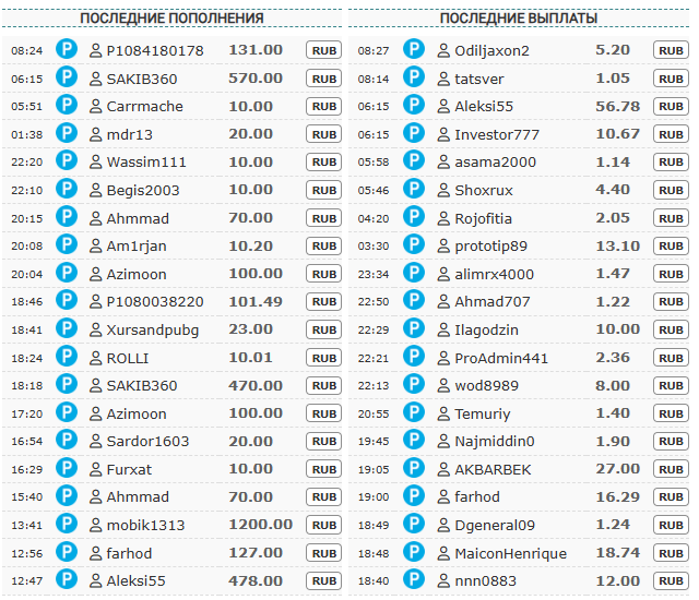Пополнения были от 10 до 1200 рублей. Пользователи P1084180178, SAKIB360, Carrmache вносили деньги круглосуточно. А вот выплаты – от 1 до 56 рублей. Копейки.