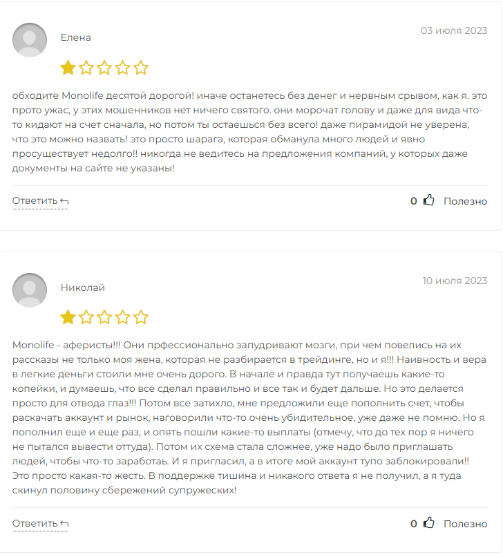Отзывы о Monolife в основном негативные. Люди жалуются на обман и заблокированные аккаунты. Деньги не выводятся совсем.